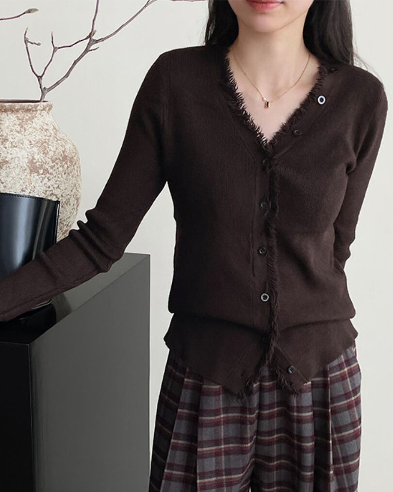 襟からフロントにかけてあしらわれたボタンと、フリンジの縁取りが可愛いニットカーディガン。